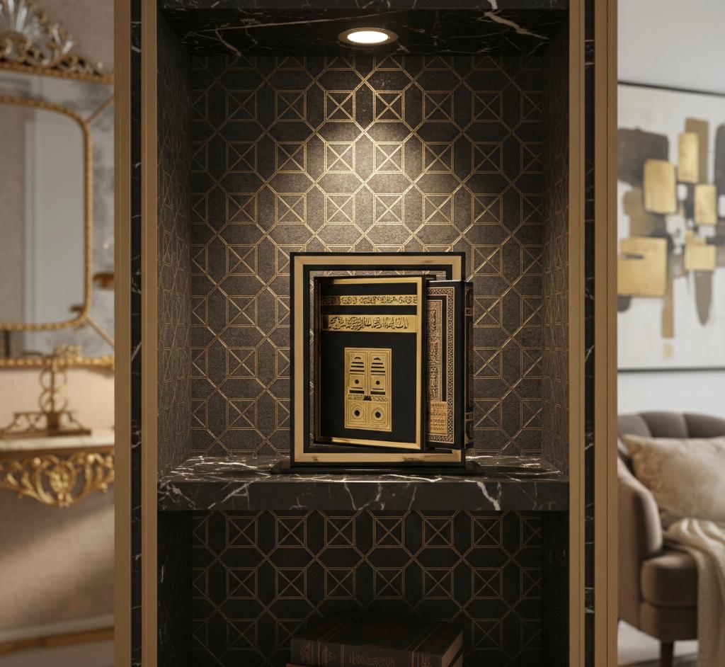 * Détails Luxueux : Conçu avec des finitions en noir profond et or brillant, rappelant l’esthétique majestueuse de la Kiswa de la Kaaba.